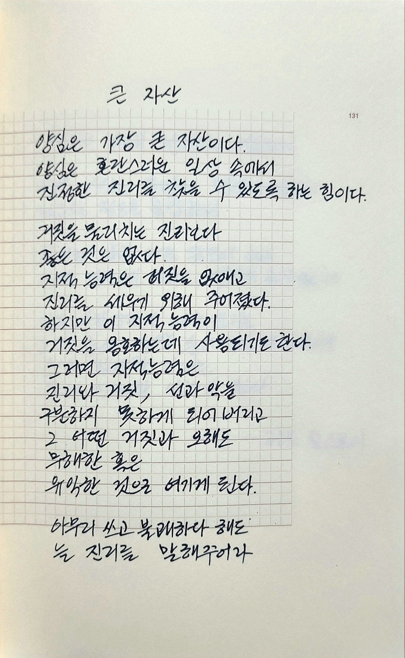 사람들이 똥밭 지름길을 피해 오솔길로 애둘러 가는 이유는 지름길이 빠르다는 것을 모르는 것이 아니라 제 아무리 빨리 간다 해도 똥밭을 지나면 하루 종일 내 몸에 똥냄새가 날 것을 알기 때문이다. 하지만 이 지독한 똥냄새를 '지름길을 걸어간 사람만이 풍길 수 있는 향기'라고 알고 있는 자들은 거침없이 똥밭을 걸어갈 것이다. 바로 그 차이다.
