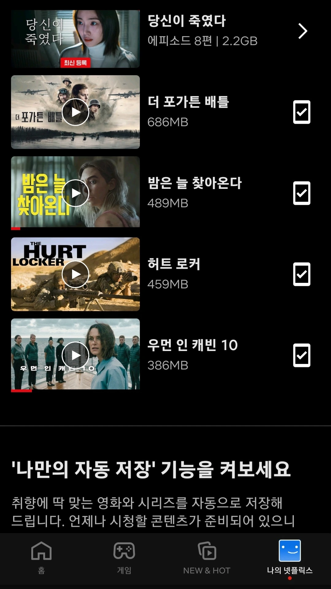 해서 만일을 대비해 저장해 둔 영화 덕을 톡톡히 보는 중이다. 넷플릭스에서 보거픈 영화를 미리 저장해 두면 나중에 통신이 되지 않거나 와이파이가 되지 않는 오프라인에서도 영화를 볼 수 있다.