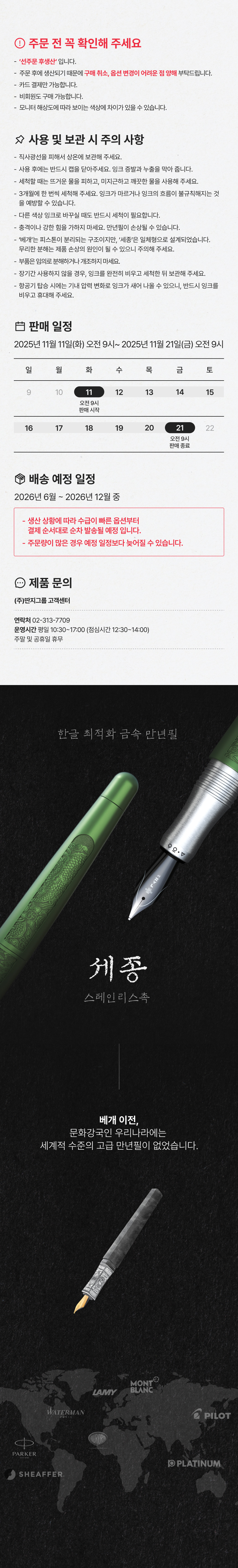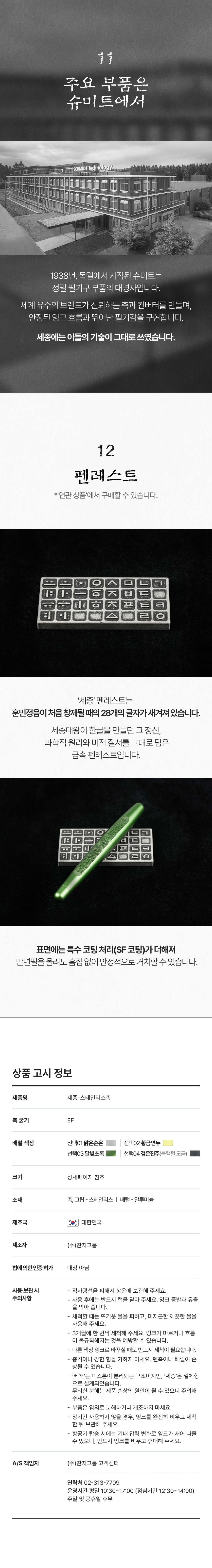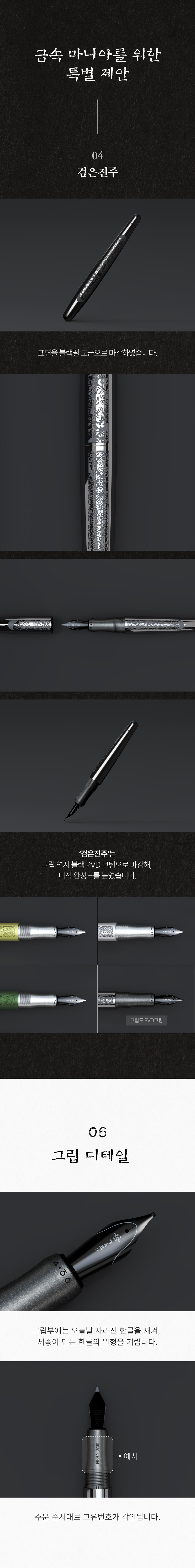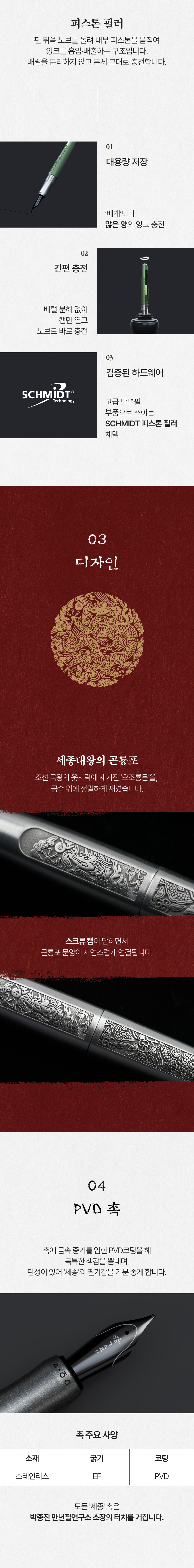 서설이 길었다. 만년필 베개를 탄생시킨 이 두 사람은 차기작으로 한글의 창시자인 '세종대왕'을 기념하는 의미와 더불어 한글을 위한 만년필로 '세종'을 출시하겠다는 출사표를 낸 바 있다. 그리고 최근 '만년필 세종'을 출시했다. 나는 그 소식을 듣고 놀라운 스펙에 비해 터무니 없이 싼 가격에 다시 한 번 놀라며 '검은 진주'와 '달빛 초록' 두 종류를 서둘러 주문했다. 그래서, 친구들에게 이 소식을 직접 전하고자 이렇게 굳이 몇자 적는다. 한정판인 만큼 곧 주문창이 닫힐 수 있으니, 잘 살펴보고 마음에 들면 빨리 주문하기를... - richboy