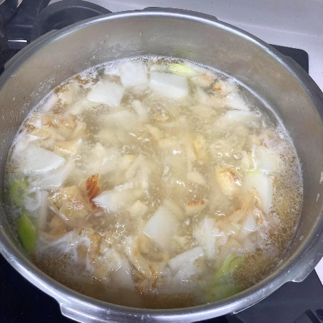 살짝 숨이 죽었다 싶으면 1번 과정에서 나온 황태채 우린 물을 냄비에 붓고 푹 끓인다.
