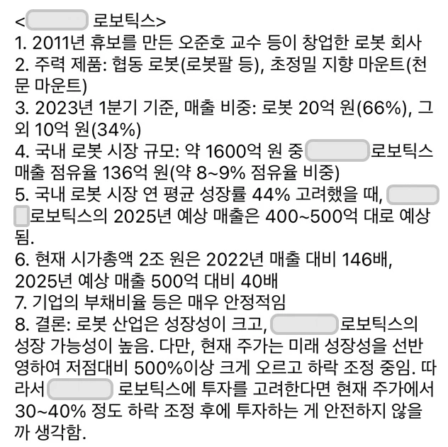 8. 하루 동안 R사의 사업보고서, 로봇산업, 대주주 조사 등을 통해 알게 된 조사한 내용을 요약하여 알려드림.
