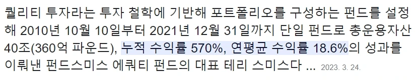 44. 테리 스미스의 관점은 직장인 투자자들에게 큰 귀감이 될 수 있음.