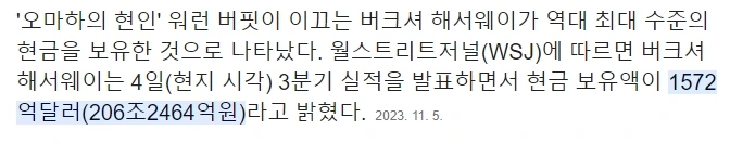 16. 워런 버핏의 버크셔 해서웨이는 11월 초 기준, 200조가 넘는 현금을 보유하고 있음.