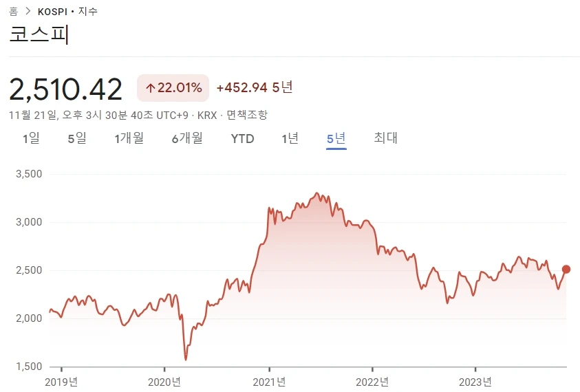 27. 2021년 상반기까지 코스피 오르는 느낌이더니, 현재는 기껏해야 2,500 턱걸이라는 것임.