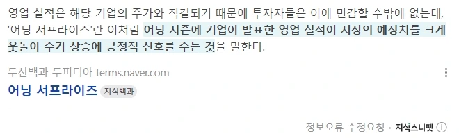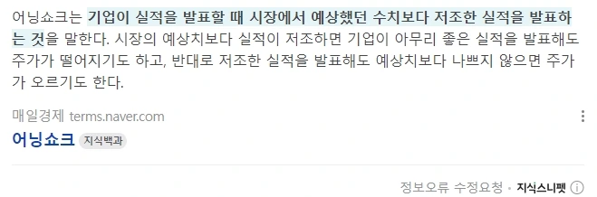 22. 그러니 증권가 예상치보다 높으면 '어닝 서프라이즈', 예상치보다 낮으면 '어닝쇼크'라고 하는 것임.