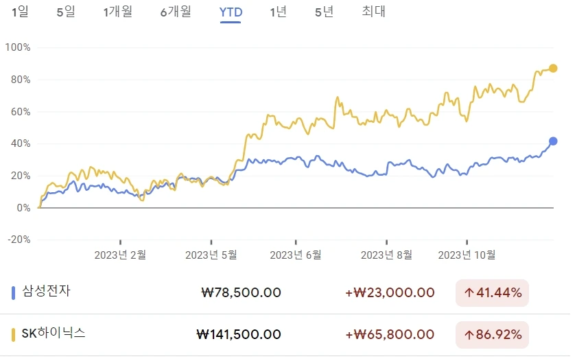 8. 한국 증시의 대표 원투펀치, 삼성전자와 하이닉스도 지난 1년 동안 각각 +41%, +87% 크게 상승하였음.