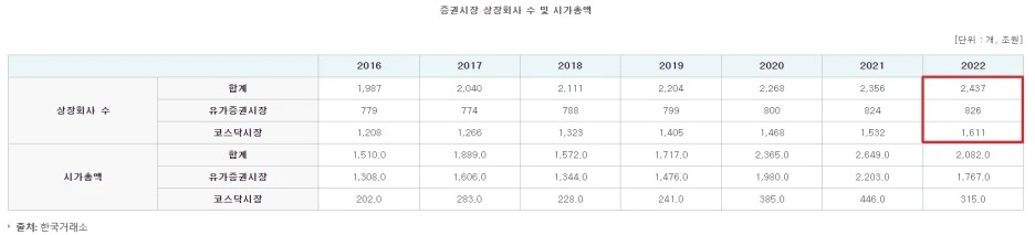 1. 한국 주식 시장에는 2,400여 개 기업들이 상장되어 있음.