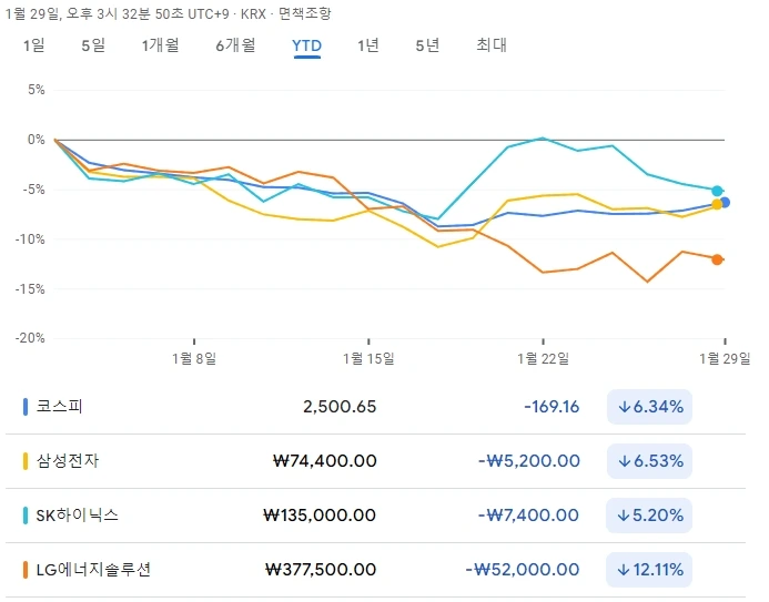 1. 한국 시장의 대표 지수, 코스피는 여전히 연초 대비 -6%의 하락을 마크하고 있음.