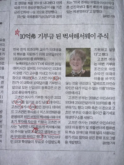 25. 루스 고츠먼 여사가 알버트 아인슈타인 의대에 10억 달러를 기부한 기사임.