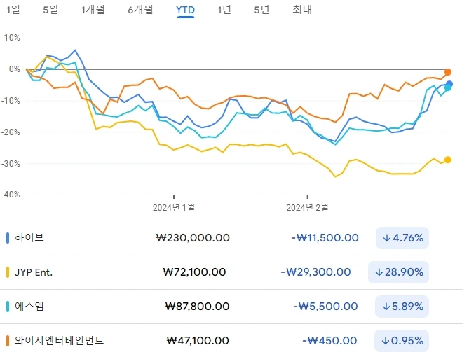 43. 맞지맞지, 연초 대비 엔터 4사의 주가는 마이너스임.
