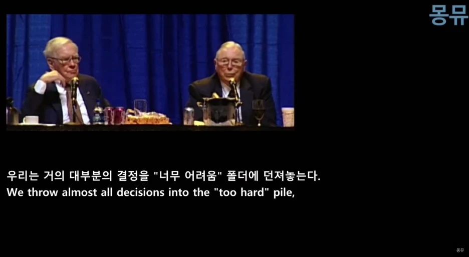37. 멍거 옹이 너무 어려움 폴더에 던지라는 것은 모르는 분야는 포기하는 게 잘못된 투자 가능성을 제거하는 쉬운 방법임을 말씀해주시는 것임.