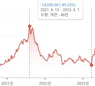 9. 물론, 신고가를 달성했을 때 유의미한 규모의 투자가 아니었기에 매도할 생각도 없었고, 특정 테마 이후에 주가는 1년 8개월 간 -50% 하락했음.