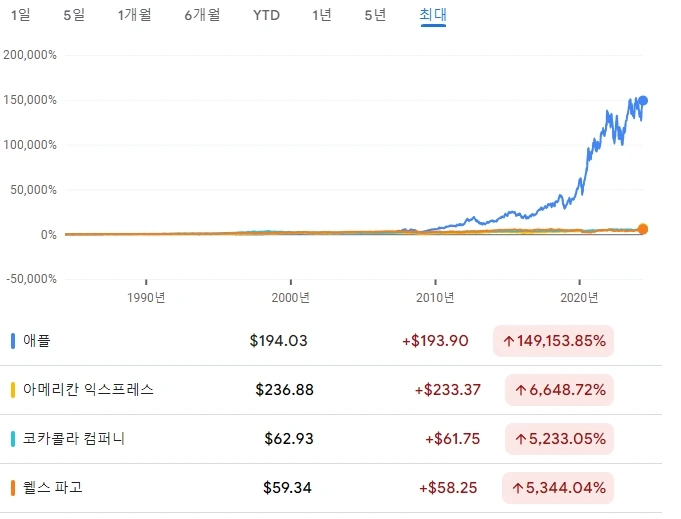 48. 애플, 아멕스, 코카콜라, 웰스 파고 등 지분 투자로 탁월한 기업을 오래오래 보유하고 있음.