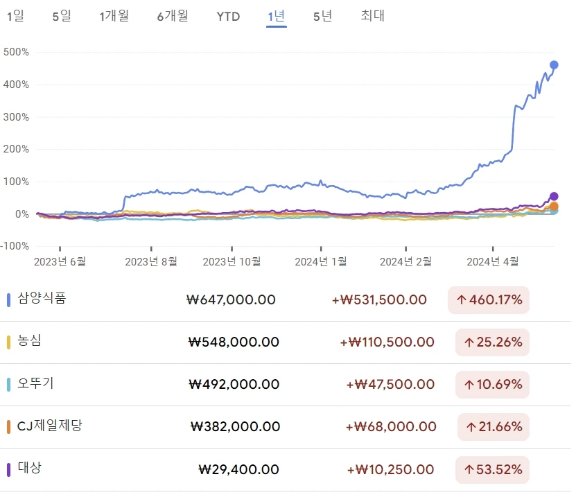 불닭볶음면의 삼양식품을 필두로 신라면의 농심도 신고가를 찍은 것 같고, 오뚜기도 앞서 두 개 기업에 비해 튀진 않지만 어느덧 52주 신고가를 찍었더랬다. 그 외에도 비비고의 CJ 제일제당과 대상 등도 실적 상승이 동반되며 주가가 올랐다.