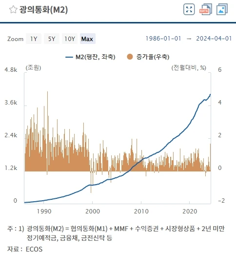 7. 아래 그래프를 보면 장기적으로 통화량은 계속 증가하는 것을 추세적으로 알 수 있음.
