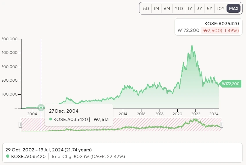 2004년 12월 말, 당시 네이버는 주 당 7,600원 대였다. 현재 네이버가 고점 대비 많이 하락했음에도 주 당 170,000원 대를 형성하고 있으니 20년 전 고점이라고 생각되는 시점부터 20년을 투자했어도 수익률은 2,000%를 넘는다.