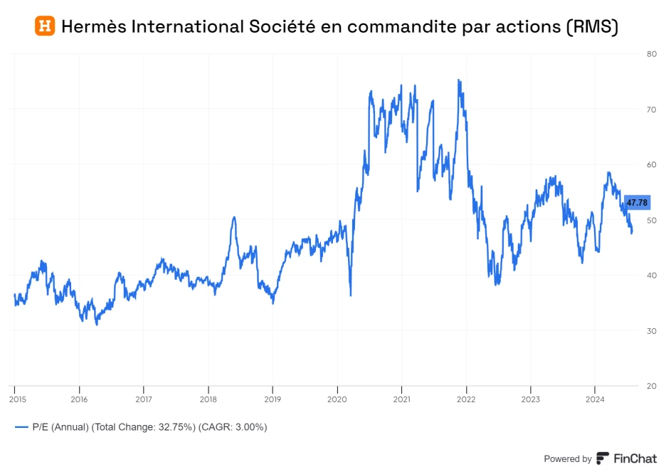 46. 에르메스의 PER 배수는 48배로 S&P500 PER 28배 대비 고 밸류에이션 상황임.