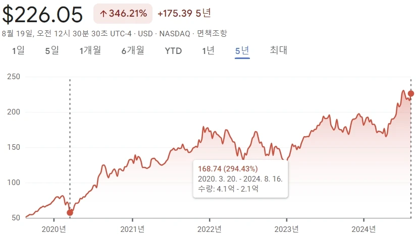 23. 그런데, 코로나19 폭락이 올 줄 몰랐던 19년 8월부터 애플을 지금까지 보유했다면 수익률은 346% 올라감.
