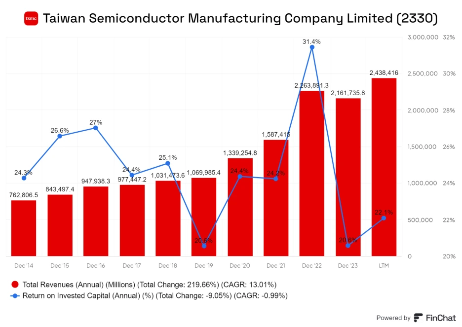 반면, TSMC는 최근 10년 동안 매출이 일관되게 연평균 13% 성장하였으며, 경영진의 ROIC(투하자본수익률)도 20% 이상을 유지하고 있습니다.