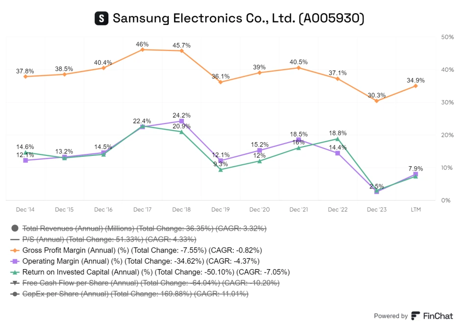 기업은 매출에서 비용을 빼고 남은 이익으로 평가해야 하니, 얼마나 남는지 매출총이익률과 영업이익률을 보겠습니다. 제조 원가 대비 높은 마진을 확보하는지 알 수 있는 총이익률은 2017년 46%를 달성한 후, 6년간 하락하여 2023년 30%로 떨어졌습니다. 영업이익률은 2018년 최고 호황기였던 24%를 기점으로 2023년 2.5%까지 떨어졌습니다.