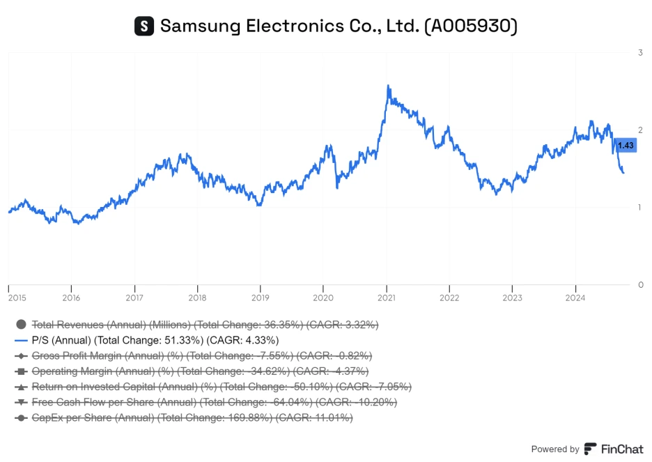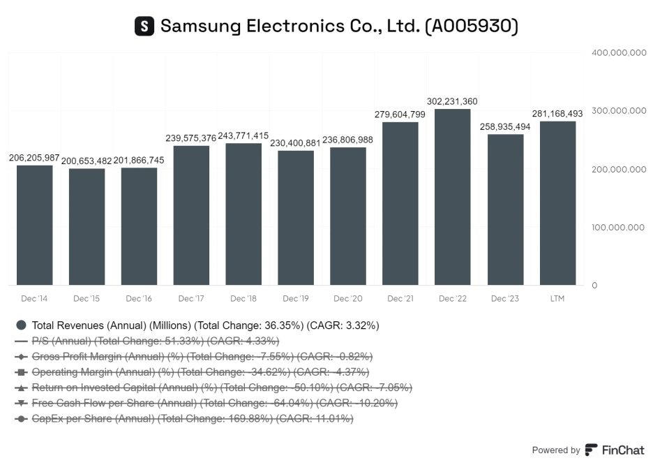 삼성전자는 최근 10년(2014~2023년) 동안 매출이 연평균 3% 성장하였지만, 핵심 사업인 메모리 반도체가 경기 순환 특성으로 인해 들쭉날쭉한 매출을 기록하였습니다.