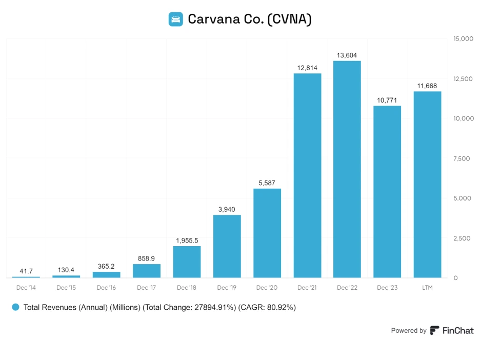 최근 10년 간 Carvana의 매출액은 사실 경이적입니다. 2014년 이래 연평균 매출 성장률은 81%를 기록했습니다.