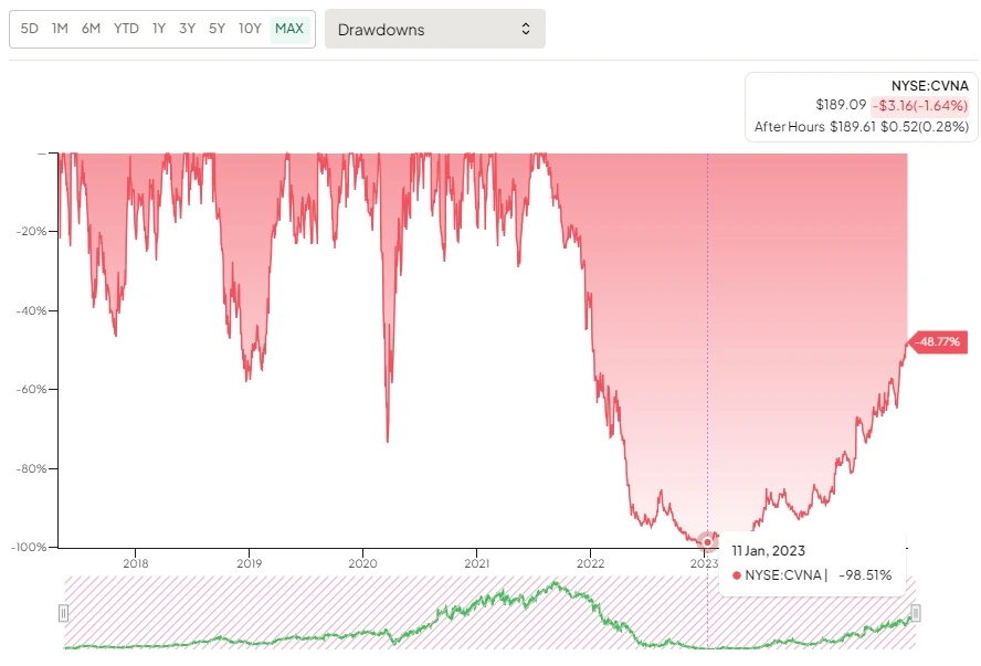 Carvana에 대해 무지한 상태로 2021년 최고점 시기에 투자했다면 2023년 1월 -99% 자산 손실을 기록했을 수도 있습니다.