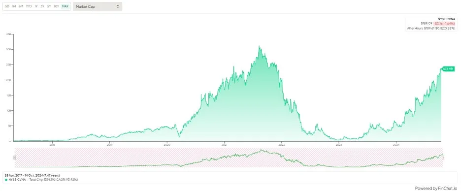 2017년 4월에 Carvana에 투자한 후 장기 보유했다면 시가총액은 현재까지 연평균 94%로 성장했습니다.