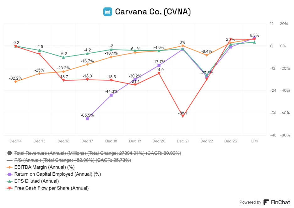 최근 10년 중 CArvana는 2023년에 들어서야 영업이익을 기록하였으며, 주당잉여현금흐름도 2023년에 처음으로 플러스를 기록했습니다. 2022년까지 회계적 이익, 잉여현금흐름이 마이너스였기에 경영진의 자본배치 능력을 보여주는 ROIC, ROCE 모두 마이너스였죠.