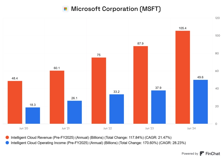 MS의 5년 간 클라우드 관련 매출은 연평균 21.5% 씩 증가했으며, 이익 증가는 연평균 28%를 넘었습니다. 영업이익률은 47%에 이르는 MS의 기여도가 매우 높은 핵심사업부가 클라우드 사업입니다.