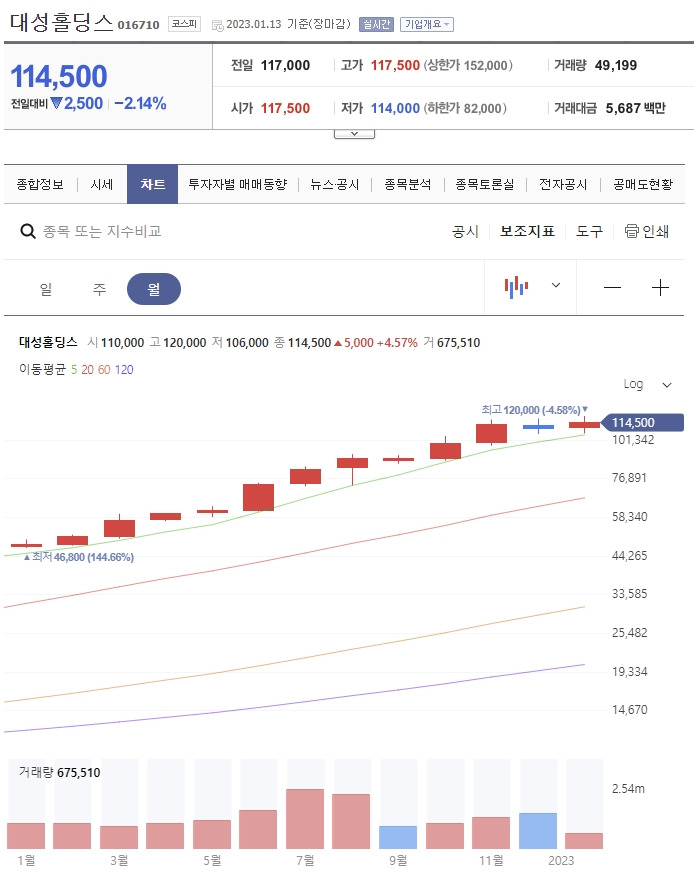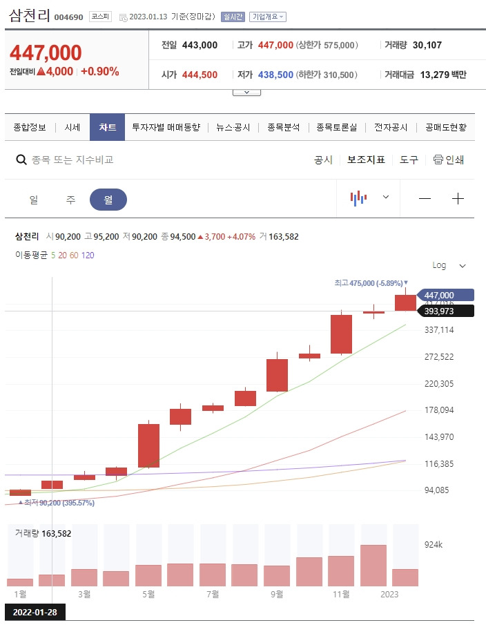 삼천리는 2022년 1월 저점(90,200원)에서 2023년 1월 고점(475,000원)까지 1년 간 427% 상승하였다. 대성홀딩스도 만만치 않다.
