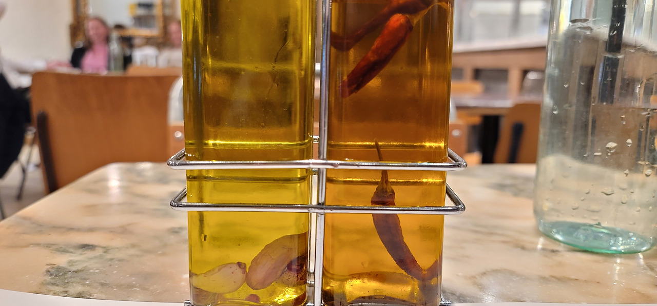 테이블마다 갈릭 오일과 칠리 오일이 있다.