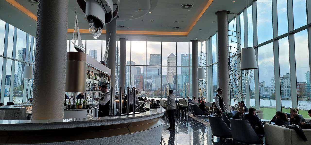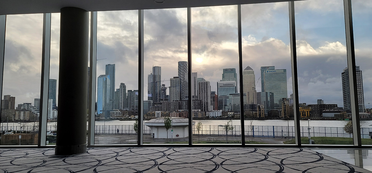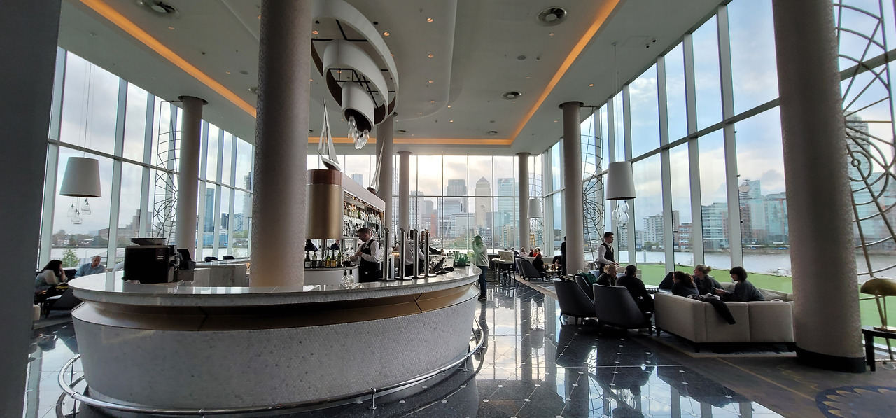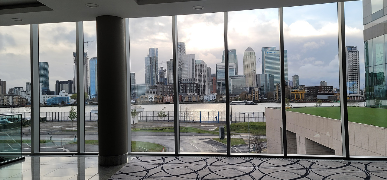 탬즈강 건너의 멋진 카나리 와프 전경이 파노라믹 하게 보인다.
