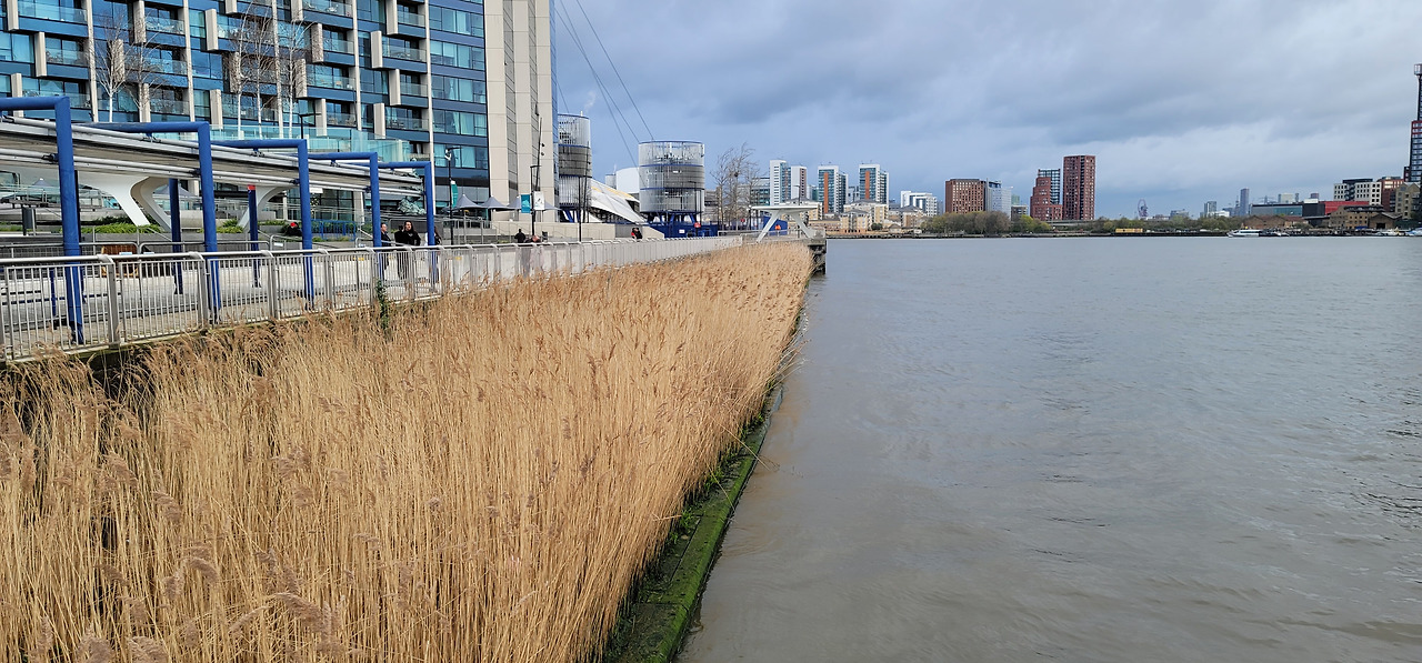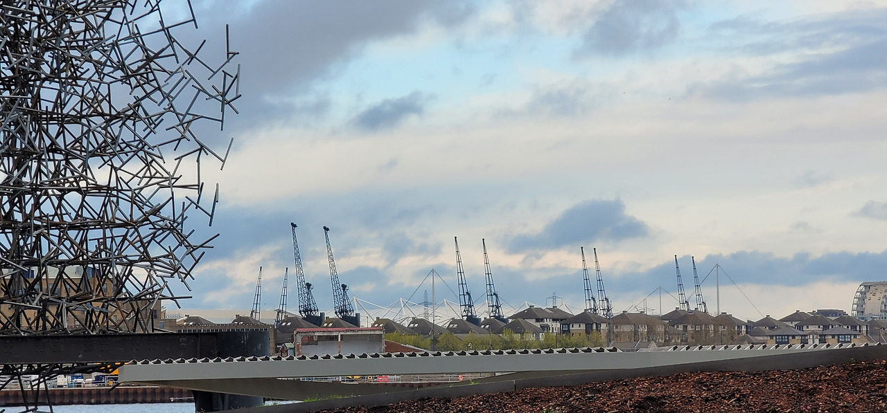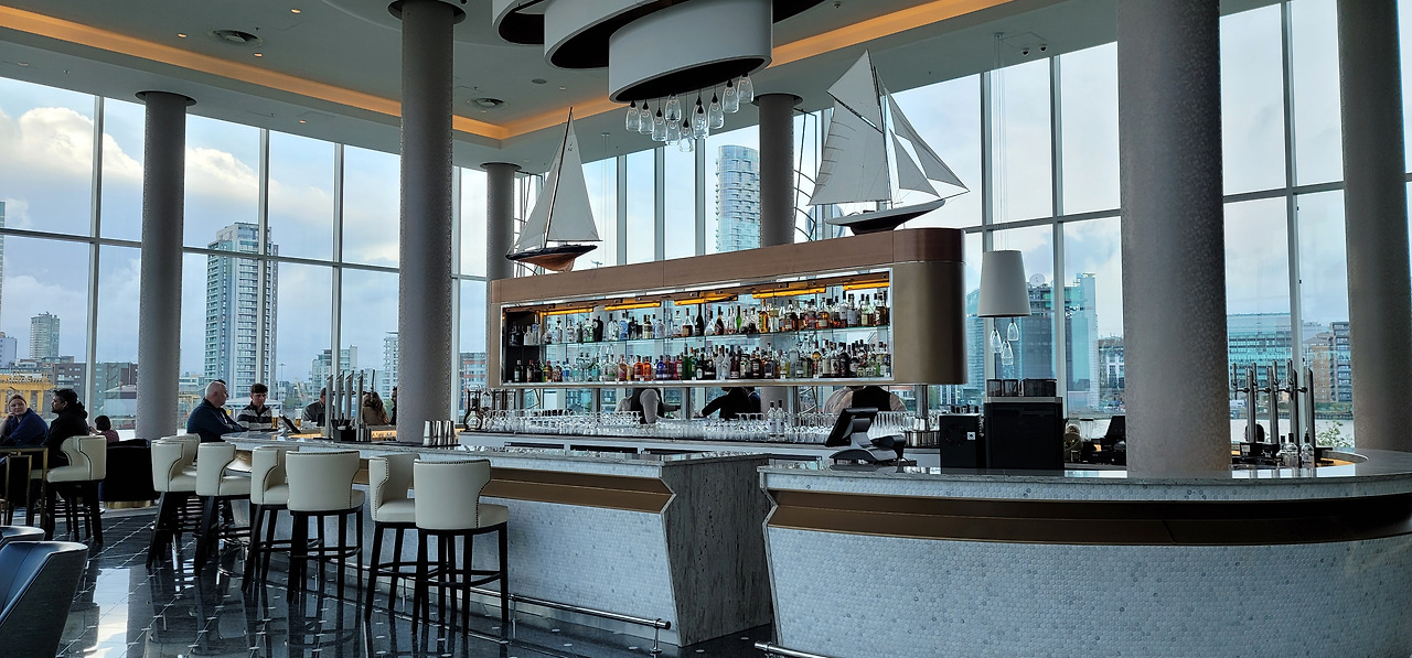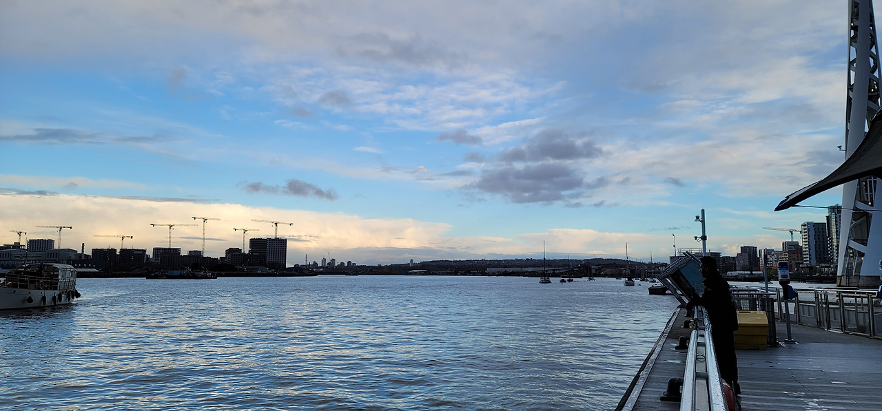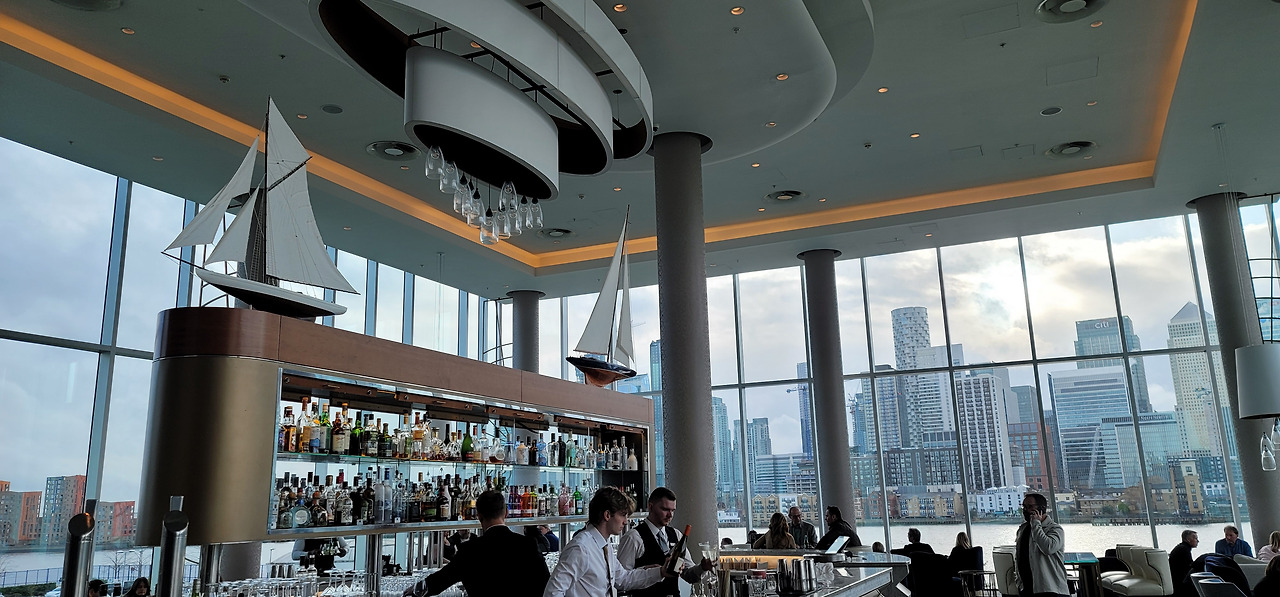 탬즈강 건너의 멋진 카나리 와프 전경이 파노라믹 하게 보인다.