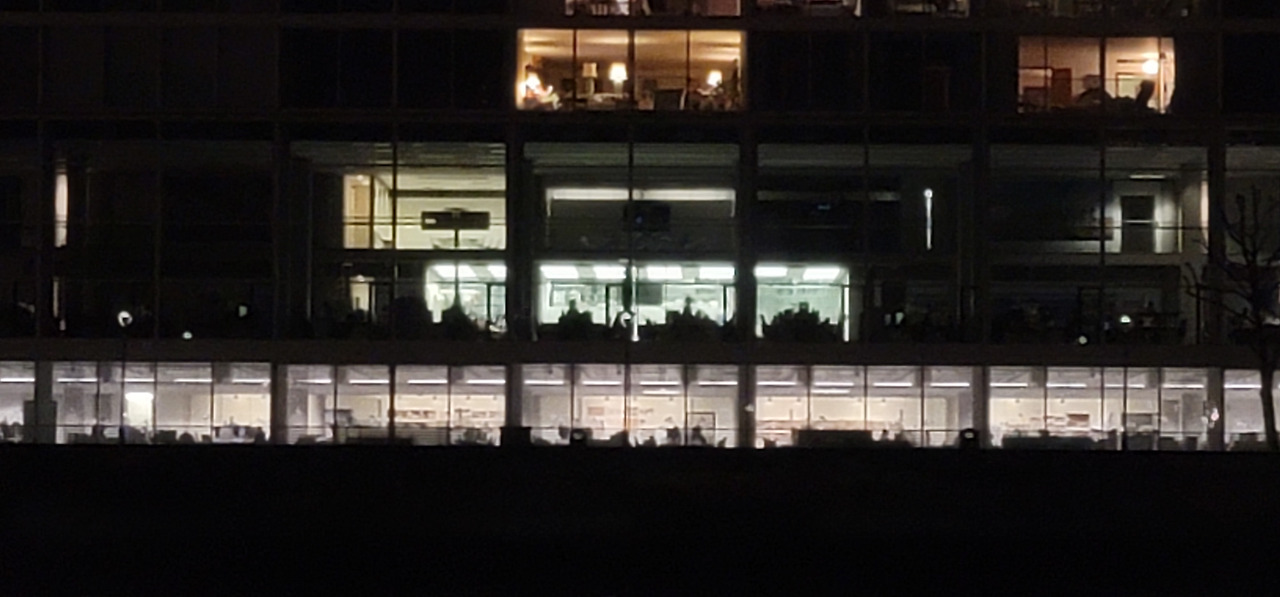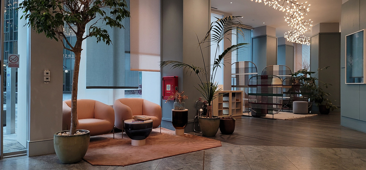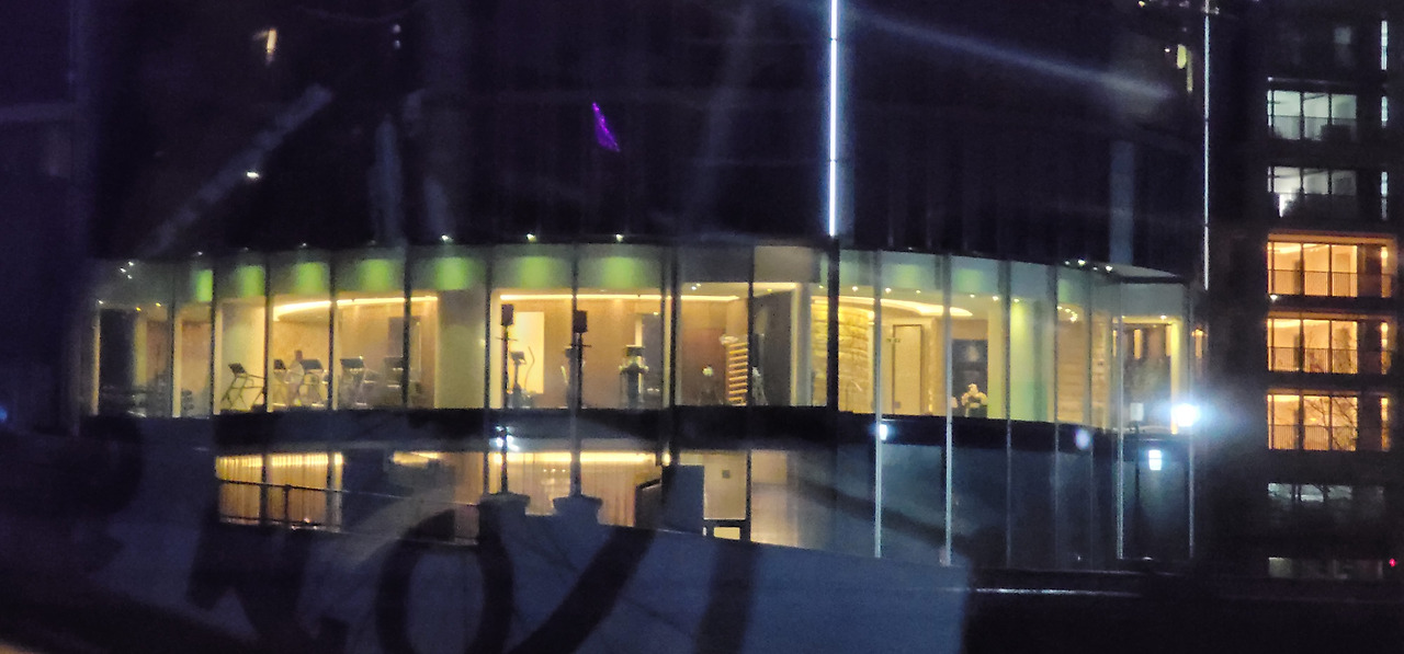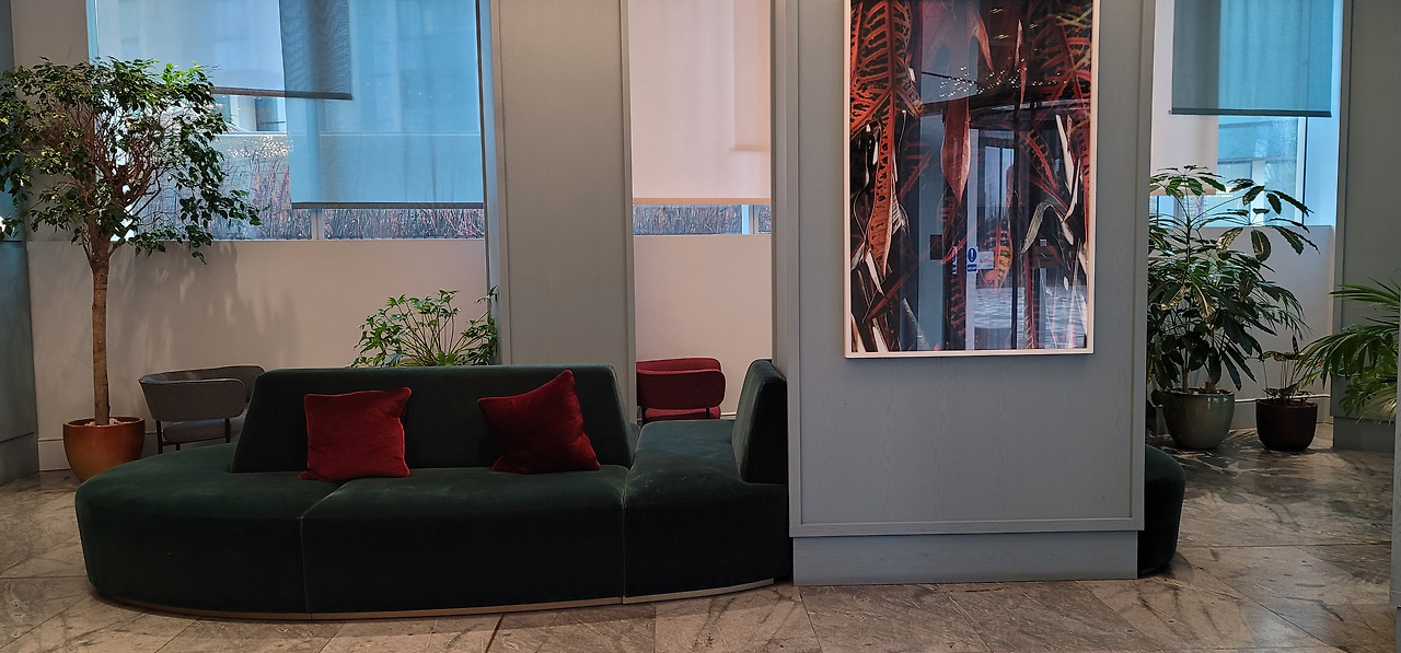1층 로비와 다르게 탁 트인 천고, 통창으로 둘러싸인 내부.