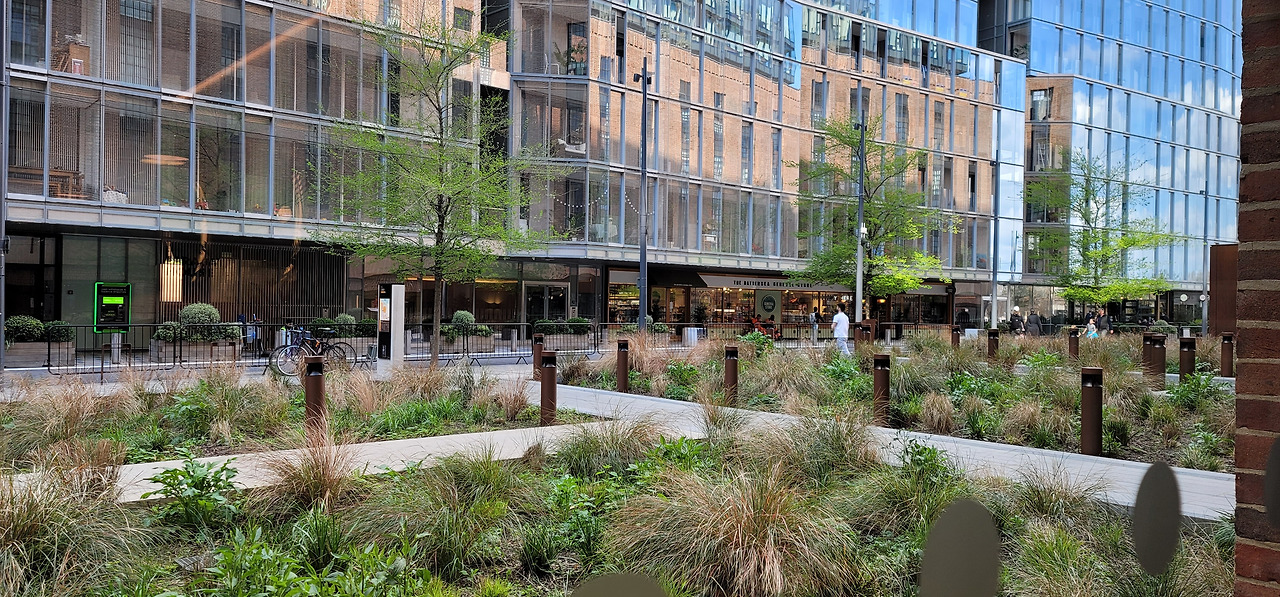 중앙의 발전소 건물을 둘러싸는 각양각색의 신규 빌딩들이 인상적이다.