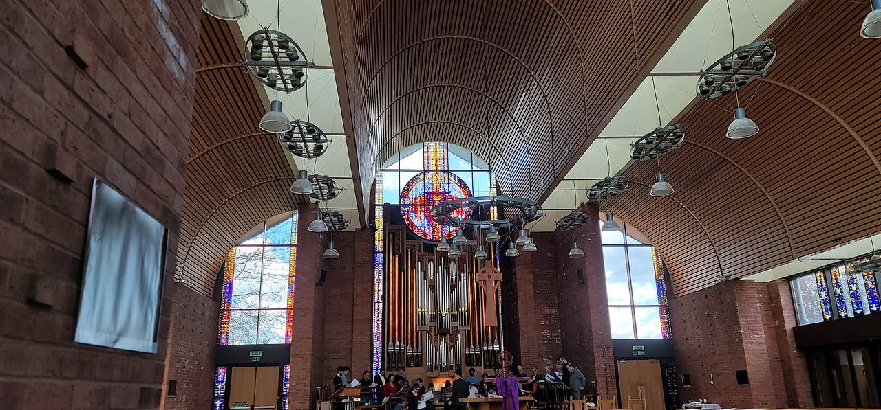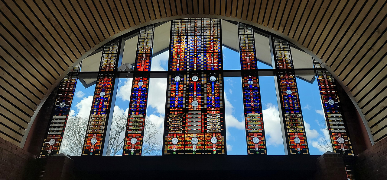 독특한 스테인드 글라스. 세로로 스테인드 글라스와 하늘이 번갈아 보이는 것이 멋지고 새롭다.