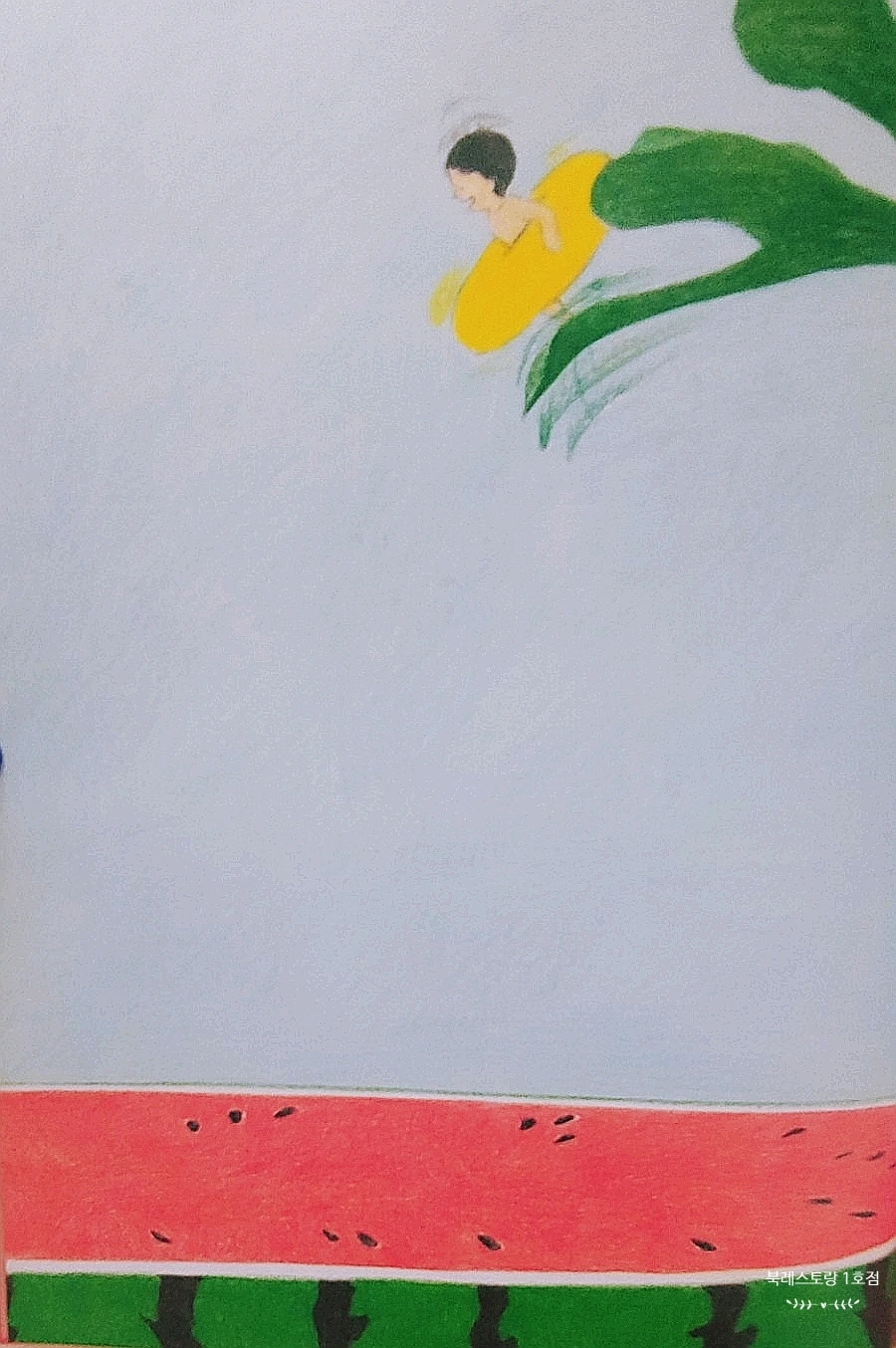 데이비드 호크니의 『첨벙』이 방금 물에 들어간 찰나의 순간을 묘사했다면, 『수박 수영장』에도 이러한 비슷한 장면이 있어요. 수영장 속에 “풍덩” 들어가는 장면입니다. 저는 이 장면을 가장 명장면으로 이야기하고 싶은데요. “풍덩”소리가 언제 들릴까 하는 긴장감과 물속에 들어갔을 때 금세 퍼질 것 같은 수박 향기로 기대감을 안겨줍니다.