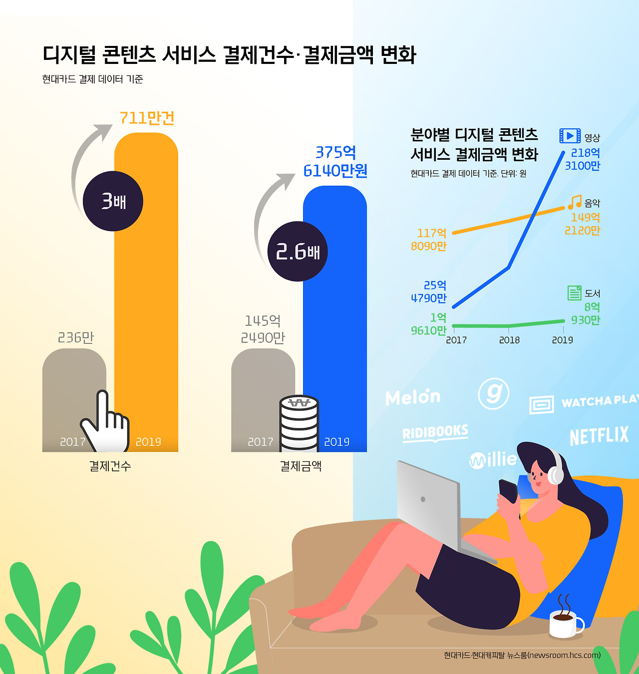현대카드 사용자들이 이들 디지털 콘텐츠 업체 10개사에서 결제한 금액은 2017년 145억 2490만 원에서 2019년 375억 6140만 원으로 2.6배 늘어났습니다. 2년 만에 시장 규모가 2.6배나 늘어난 거니까 디지털 콘텐츠 시장이 매우 빠르게 성장하고 있다는 걸 잘 아실 수 있습니다.