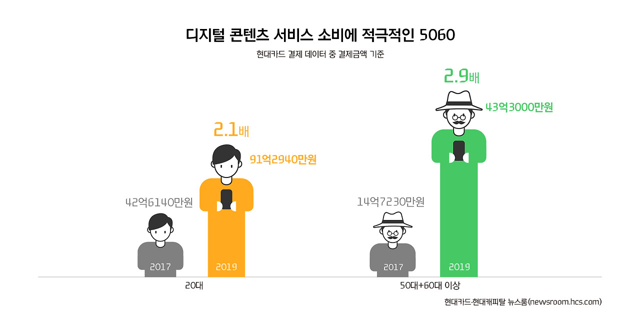 지금껏 말씀드렸듯이 현대카드의 결제 데이터를 분석한 내용을 보면 국내 디지털 콘텐츠 시장 규모가 2017년에서 2019년 사이 2년 동안 2.6배로 커졌고, 그동안 디지털 콘텐츠 소비에 소극적인 것으로 여겨졌던 5060 세대에서도 디지털 콘텐츠 이용이 빠르게 늘어나는 걸 알 수 있는데요.