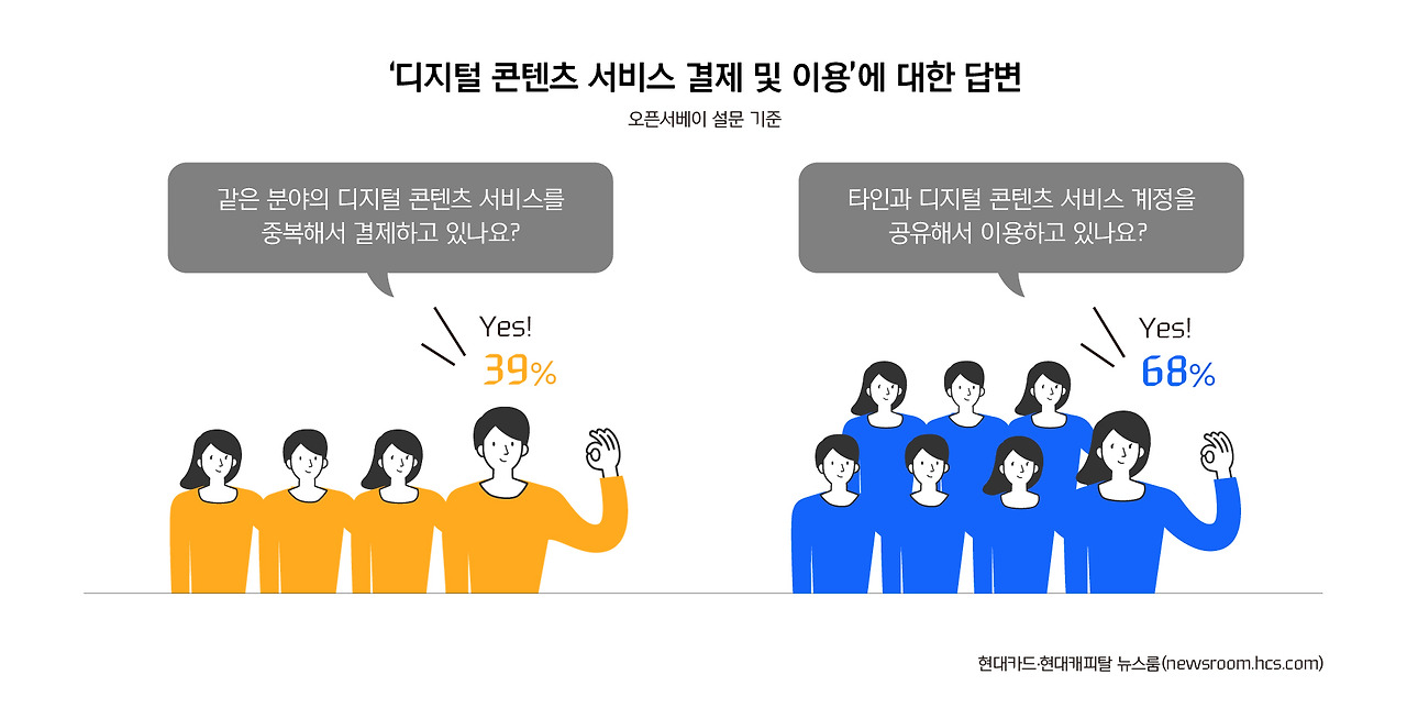 다른 재밌는 사실 한 가지도 설문조사 결과에서 찾아볼 수 있었는데요. 같은 종류의 디지털 콘텐츠 서비스를 두 개 이상 유료로 구독하는 사람들의 비중이 39% 그러니까 10명 중의 네 명에 달한다는 내용입니다.