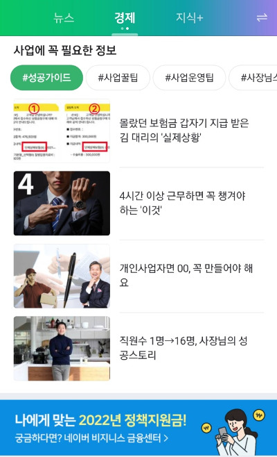 평소에는 네이버 경제판 하단에 '사업에 꼭 필요한 정보'라는 제목을 달고 16건의 콘텐츠가 노출되고 있습니다.