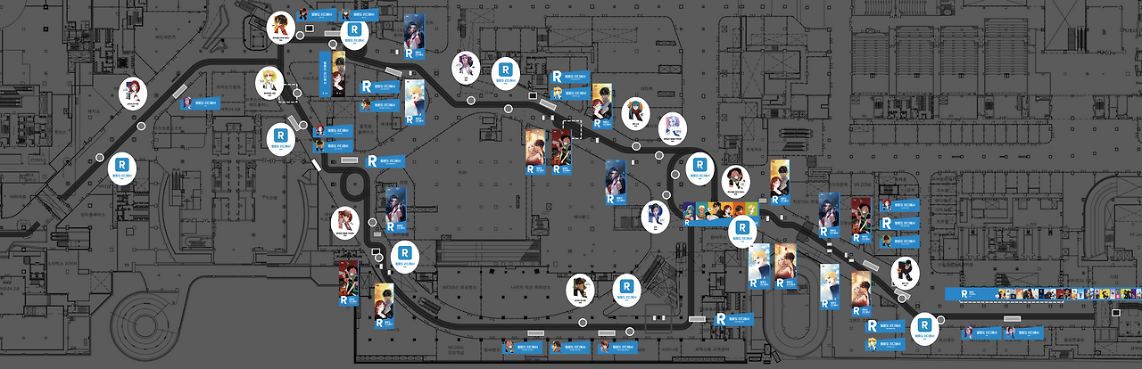 흩어져 있는 소재들을 작업할 때 가장 신경 쓴 부분은 배치였다. 삼성역 방향, 봉은사역 방향 양쪽에서 유입되는 고객들이 최대한 겹치지 않고 다양한 작품을 볼 수 있도록 배치했다. 특히 기둥 래핑과 행잉배너의 경우는 앞서 설명한 이번 캠페인 디자인의 중요 포인트를 최대한 살려 작업했다. 브랜드 심볼인 R과 소개하고 싶은 웹툰 작품의 일러스트, ‘웹툰도 리디에서’ 슬로건을 적절히 조합하고 반복 배치해 다양한 웹툰을 리디에서 만나볼 수 있다는 점을 강조했다.