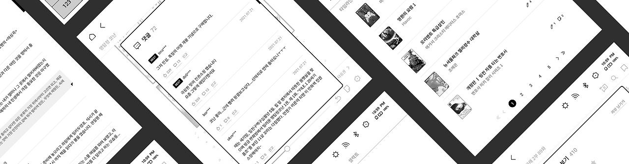 프로덕트 디자이너는 UX/UI 디자인을 진행하기 전에 제품의 특성과 환경을 파악하고 이해하는 것이 중요하다. 업무를 시작한 초기에는 페이퍼 외에도 다양한 전자책 디바이스를 사용해 보며 E Ink(전자잉크) 특성을 이해하는 데에 적지 않은 시간을 투자했다. 이는 그림을 그리기 전에 도화지의 질감과 특성을 파악하고, 그에 맞는 물감과 도구를 선택하는 것과 같은 맥락이다.