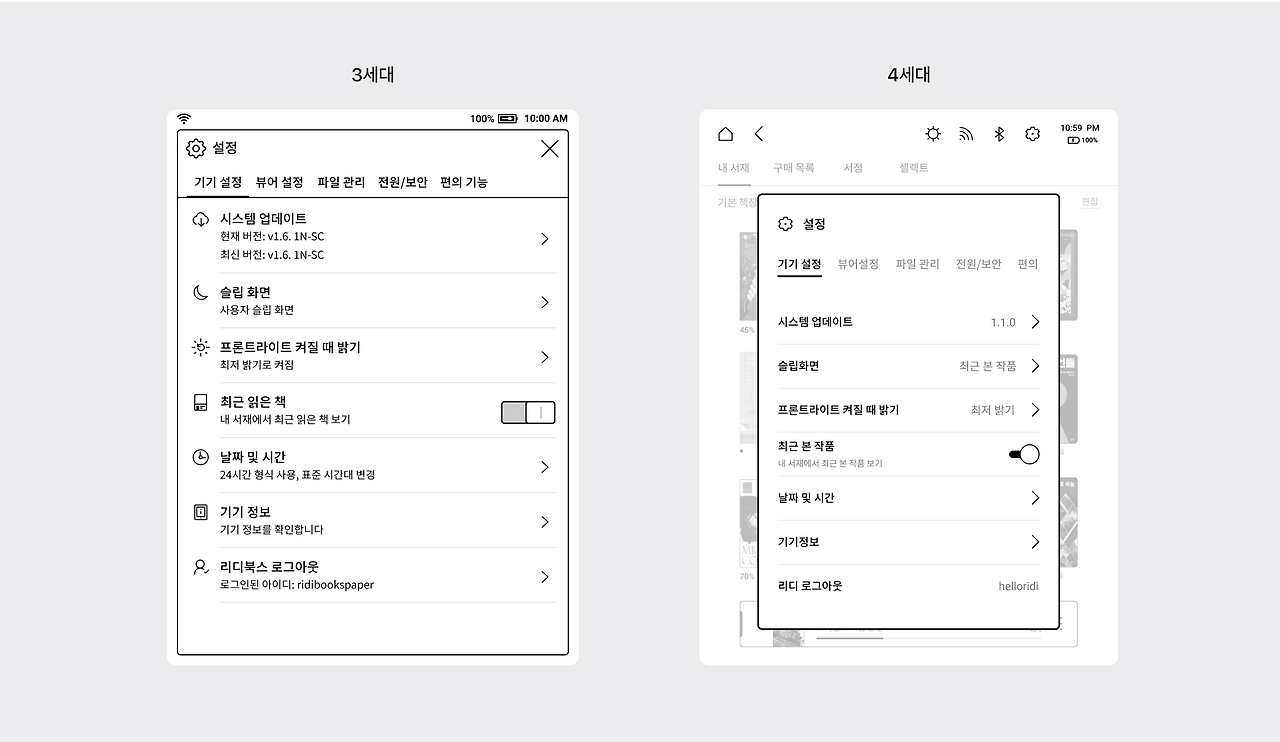 2015년에 처음 출시된 리디페이퍼 1세대 이후, 2019년 3세대까지 리디페이퍼의 기기 디자인은 조금씩 변화했지만 UX/UI는 주로 유지 보수 중심으로 운영되어 큰 변화가 없었다.