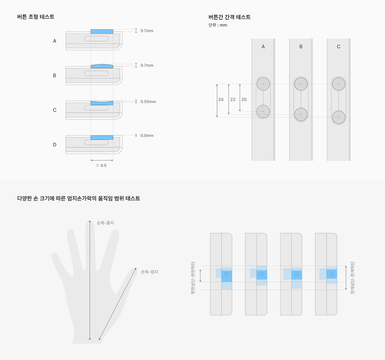버튼의 형태를 결정한 다음에는 버튼의 입체적 형상, 버튼과 버튼 사이의 간격, 그리고 버튼과 화면 사이의 간격을 정의했다.