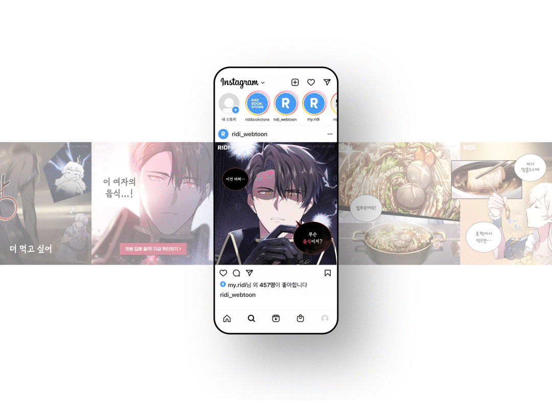 SNS상에 존재하는 다양한 방식의 카드뉴스 중에서도 콘텐츠 플랫폼의 카드뉴스는 카드를 넘기며 스토리의 흐름을 따라가고 몰입하게 되는 것이 특징이다. 리디에서는 주로 웹툰 작품을 소개할 때 이 형식을 따르는데, 단순하게 웹툰의 미리보기를 보여주는 프롤로그형 카드뉴스와는 다르다. 작품의 매력적인 스토리와 작화의 장점을 최대치로 끌어올리고 호기심을 자극해야 하므로 장면의 배치와 대사, 감정 표현 등 많은 부분을 고려해서 새롭게 디자인한다. 이런 스토리텔링형 카드뉴스 광고를 통해 고객의 흥미를 끌어 구매로 이어지는 과정에서 광고에 대한 여러 고객 반응 데이터를 쌓고 그 데이터를 기반으로 다음 마케팅의 전략을 세우게 된다.