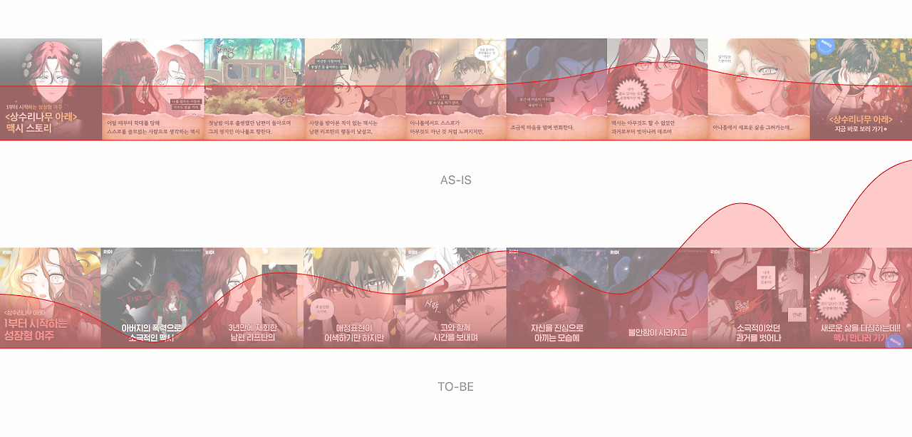 텍스트의 가독성을 높이기 위해 디테일한 부분을 변경했다. 앞서 줄거리가 많은 스토리텔링형 카드뉴스의 성과가 높다는 데이터를 기반으로 폰트 크기를 줄여 많은 줄거리를 기입할 수 있도록 텍스트 영역을 확대했다. 이때 과하게 욕심을 부려 텍스트를 많이 넣는 일은 줄거리의 가독성과 주인공의 감정표현 모두 잃게 되기 때문에 적당 부분을 설정하는 것이 중요했다. 기존에 적용하던 stroke, drop shadow 효과는 약하게 주거나 거의 사용하지 않아야 이전보다 많아진 텍스트 양도 깔끔하게 읽을 수 있었다.