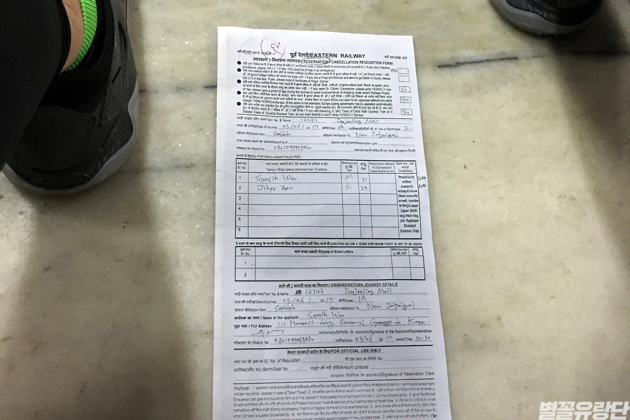 우리는 앞으로 어떤 일이 벌어질지 모른 채 환전을 마친 후 기차표 예매를 위해 예매 사무소로 향했는데, 이것 또한 만만치 않았다. 물어물어 간신히 버스를 탔고 하차 후에도 하염없이 걷고 걸었다. 햇볕은 뜨거웠고 땀이 났고 다리가 아팠다. 두리번거리며 주위를 둘러봤지만, 각종 관공서가 모여있는 지역이라 비슷하게 생긴 네모난 건물들만 빽빽하게 서 있을 뿐이었다. 슬슬 짜증이 날 그 무렵, 우여곡절 끝에 기차 예매 사무소에 도착했다! 이것 또한 가이드북에 나오는 위치와는 살짝 달랐지만 어쨌든 찾았으니 그걸로 다행이었다. 문을 열고 들어갔는데, 세상에! 엄청나게 많은 사람이 자신의 차례를 기다리고 있었다. 외국인 예매창구에는 내국인 창구보다 사람이 훨씬 많았다. 데스크에서 서류를 전달받고 근무 경찰에게 이곳이 외국인 예매창구가 맞는지 재차 확인했다. 지켜보니 단체관광객의 티켓을 대신 예매해 주는 현지인들이 꽤 있었다. 우리나라로 따지면 여행사 직원들인 셈이다. 우리는 원하는 시간에 원하는 기차 좌석이 남아 있는지 간절히 확인하고 싶었다. 혹시나 하는 마음에 와이파이를 찾았으나 헛수고. 결국 가방에 있던 신문지를 깔고 앉아 순서가 오기만을 기다렸다. 우리 번호는 42번. 두세 시간을 앉아 있으니 엉덩이가 시리고 아팠다. 하지만 천장에 돌아가는 팬 덕분에 실외만큼 덥지 않아 그걸 위안으로 삼았다. 부디 내일 출발하는 기차에 자리가 있기를 빌던 간절한 마음도 점점 사그라들었다. 모든 단계를 다 건너뛰고 하루빨리 다질링으로 가고 싶었다. 긴긴 기다림으로 지칠 무렵, 드디어 우리 차례가 됐다. 친절한 인도 아저씨는 우리의 서류를 보더니 원하는 일등석은 없지만 이등석에 자리가 있다고 했다. 아싸! 빨리 여길 뜨자! 우리는 안도의 함박웃음을 보였고 아저씨도 함께 좋아해 줬다.