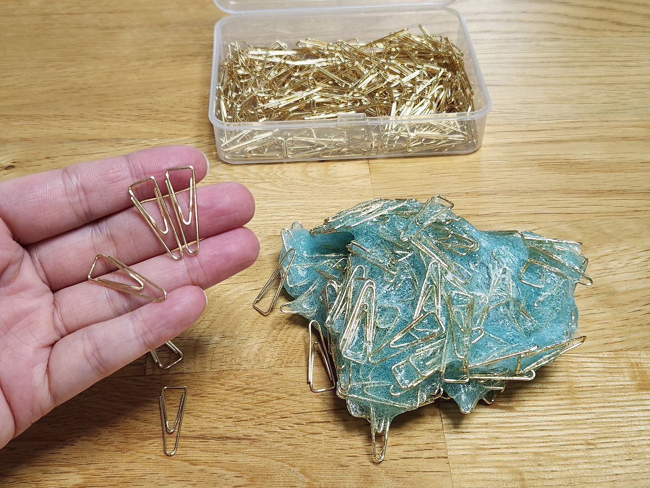 아쉬운 마음에 괜히 손가락으로 쿡쿡 찌르다 문득 무언가가 떠올랐다. 서랍을 마구 뒤적이다 구석에 박혀있던 상자를 꺼냈다. 상자 안에는 길쭉한 삼각형 모양의 클립이 한가득 있었다. 충동적으로 샀던 특이한 클립은 각진 모양이라 종이에 끼우려면 정성을 들여야 했다. 매번 급하게 쓰다 종이를 찢어먹다 보니, 언젠가부터 찾지도 않고 서랍 속에 두었다. 나는 망설임 없이 클립을 한 움큼 쥐고, 슬라임 위에 뿌렸다. 말랑한 슬라임에 납작한 클립을 마구 섞었다. 단조로운 느낌만 내던 슬라임에 딱딱한 클립이 존재감을 드러냈다. 서로 부딪힐 때마다 뽀드득, 뽁- 하고 소리를 내기도 했다.